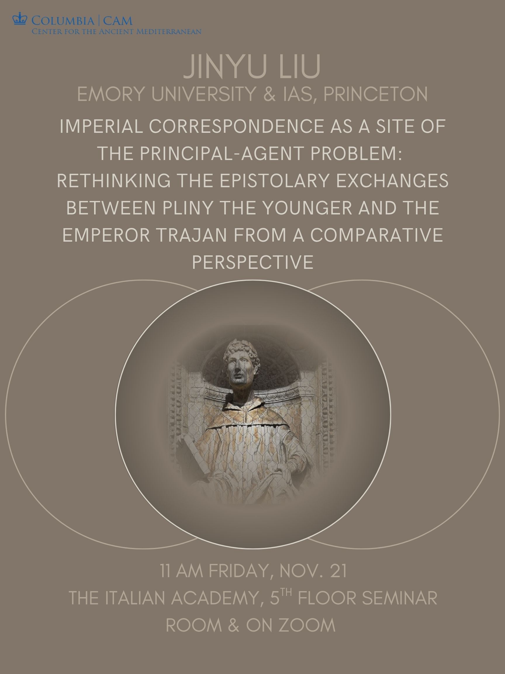 Events Upcoming Events Nov 21, 2025 Jinyu Liu: “Imperial Correspondence as a Site of the Principal-Agent Problem: Rethinking the Epistolary Exchanges between Pliny the Younger and the Emperor Trajan from a Comparative Perspective” Fri, Nov 21, 2025 , 11:00 am – 1:00 pm The Italian Academy, 5th floor seminar room